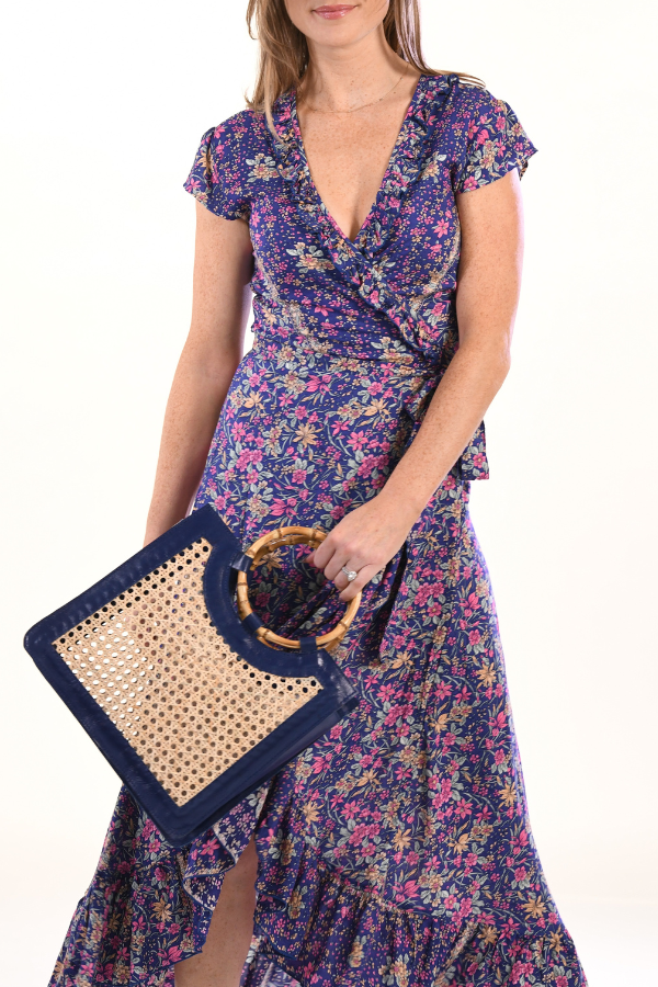 Bamboo Handle Wicker Bag / Navy